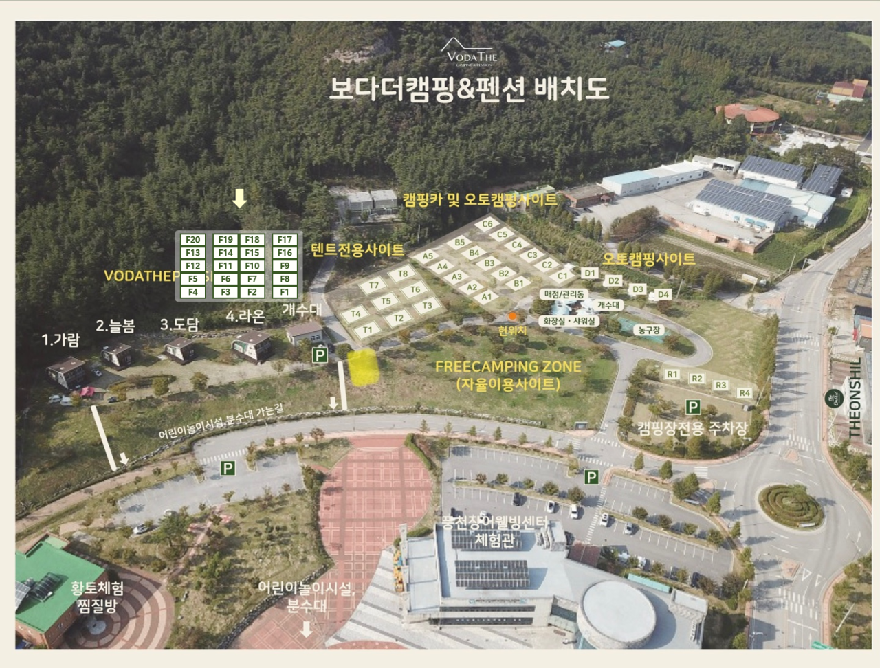 보다더캠핑장은 개별 전기, 수도, 오수처리시설이 있는 20개의 캠핑카 및 오토캠핑 사이트, 12개의 텐트사이트와 15개의 잔디노지사이트로 이루어져 있습니다.