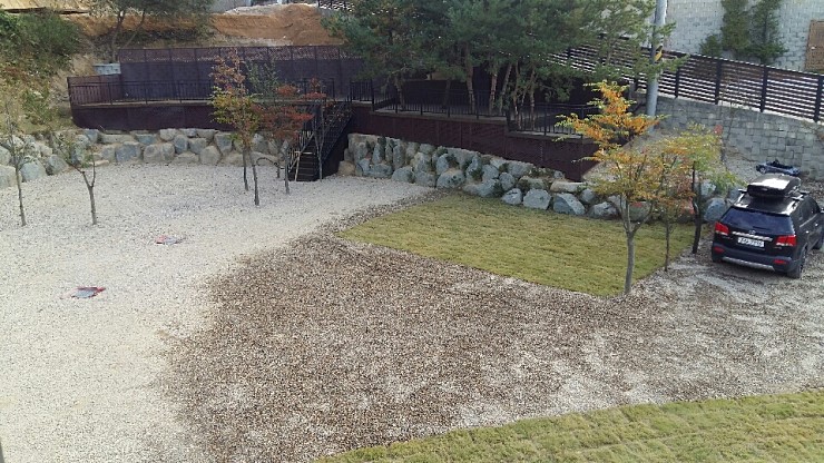 데크, 잔디, 자갈