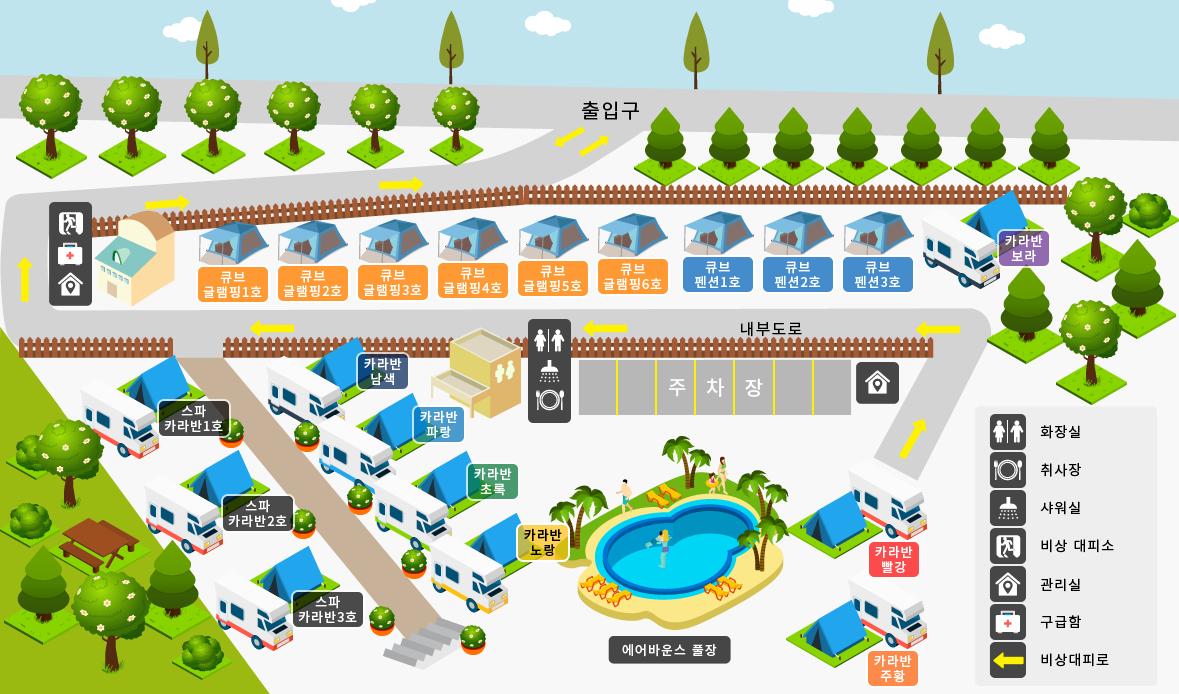 - 주차는 한 카라반 사이트 내 1대 가능하며 무료입니다. (추가 차량은 캠핑장 외부 유료주차장을 이용하시기 바랍니다.)