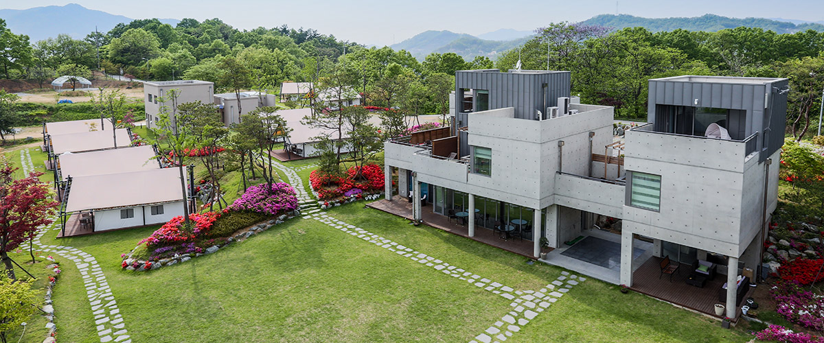 노출 콘크리트의 현대식 펜션 건물을 뒤로하고 멀리 내려다 보이는 한강과 양평시내 전경은 주변의 전원풍경과 어우러져 오감을 즐겁게 합니다.