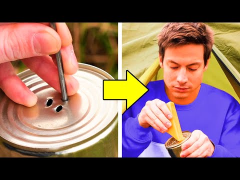 다음 모험 전에 배워야 할 야영과 생존 요령여행자 여러분, 이번 영상에서는 자연 속에서 더욱 즐거운 시간을 보낼 수있는 놀라운 캠핑 팁을 보여 드리려고 합니다.= 야외 샤워를 하려면 비닐 봉지에 물을 담아 나뭇 가지에 매달아 두세요. 비닐 봉지의 아래 부분을 몇 곳을 뚫으시면, 짜잔!= 빈 깡통 바닥에 구멍을 뚫어 치즈 ..
